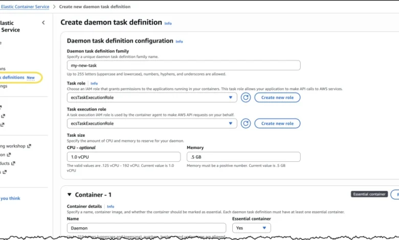Within the Amazon ECS console, a new navigation option, "Daemon task definitions," becomes visible. This is where platform engineers define the parameters for their managed daemons. The creation process involves specifying details such as the desired CPU and memory allocation for the daemon. For the CloudWatch Agent example, 1 vCPU and 0.5 GB of memory were allocated. A descriptive name is assigned to the "Daemon task definition family" for easy identification.