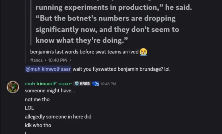 By the time this article was published, many of the affected proxy providers had been notified by Brundage and had begun patching the vulnerabilities, significantly hindering Kimwolf’s expansion capabilities. Within hours of the article’s release, Dort retaliated by creating a Discord server bearing this author’s name. This server was used to disseminate personal information and issue violent threats against Brundage, KrebsOnSecurity, and others involved in the investigation.
